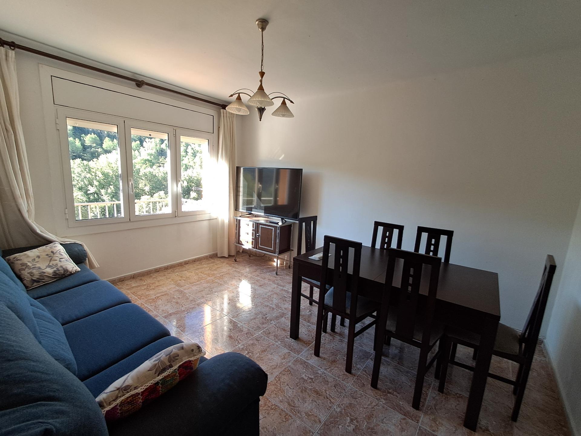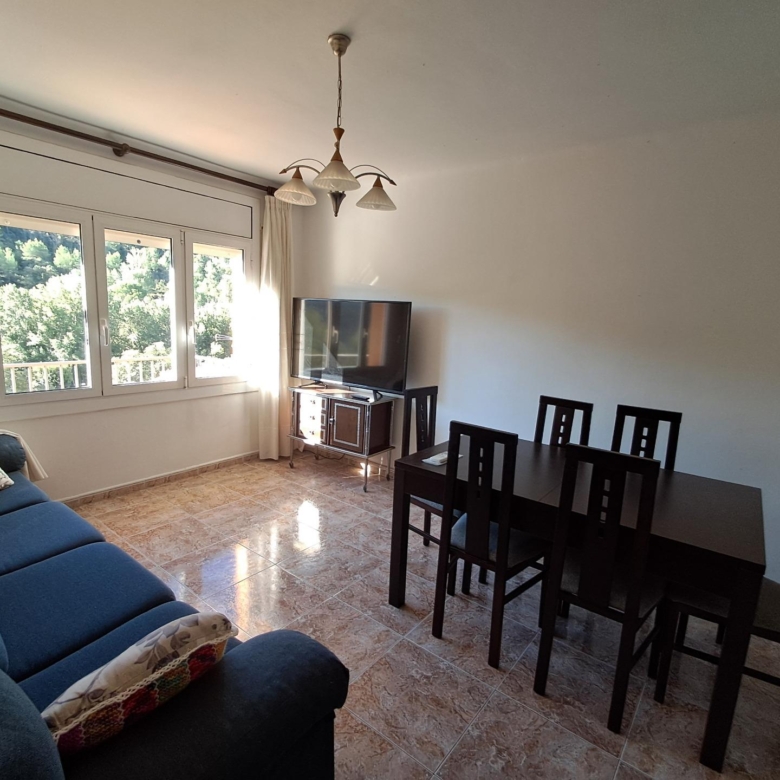 Salón-comedor luminoso con salida a balcón orientado al sur y vistas abiertas a la montaña.